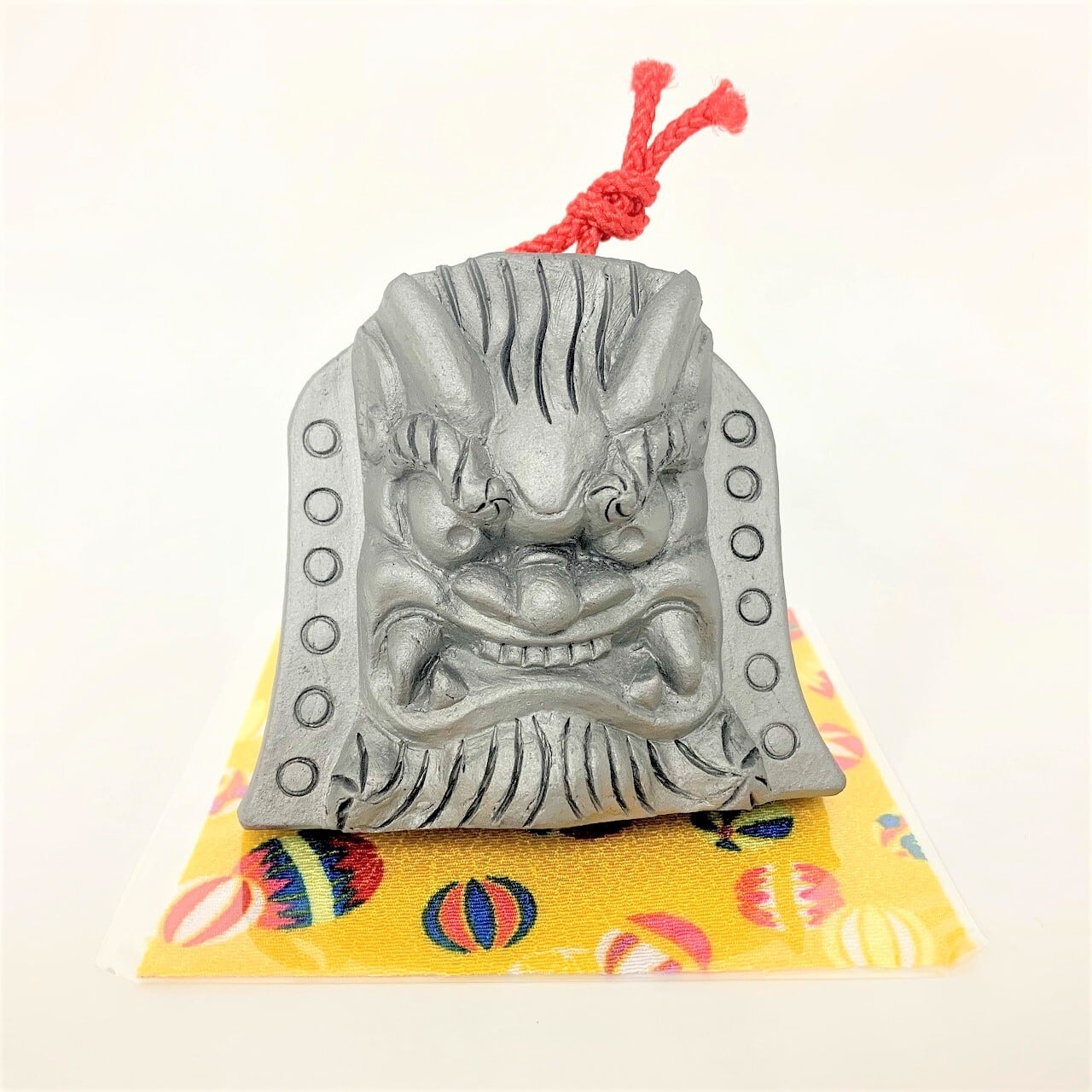 女性鬼師kumiが一つ一つ丁寧に無病息災の願いを込めて作ったミニ鬼面鬼瓦になります。女性らしい感性で鬼瓦のいぶし色に合う色鮮やかな敷布を付けてみました。